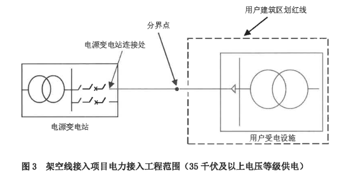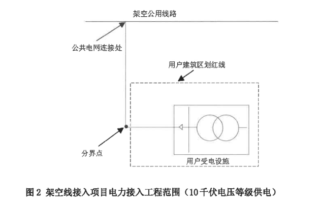 (一)架空线接入项目电力接入工程范围为用户建筑区划红线外第一断路器或第一支持物至公共电网(35千伏及以上电压等级供电项目,为电源变电站)连接处的所有电力工程,以用户电源线路接入用户建筑区划红线处第一断路器或第一支持物的连接点为分界点,分界点电源侧供电设施属于电力接入工程范围,负荷侧受电设施由用户投资建设。