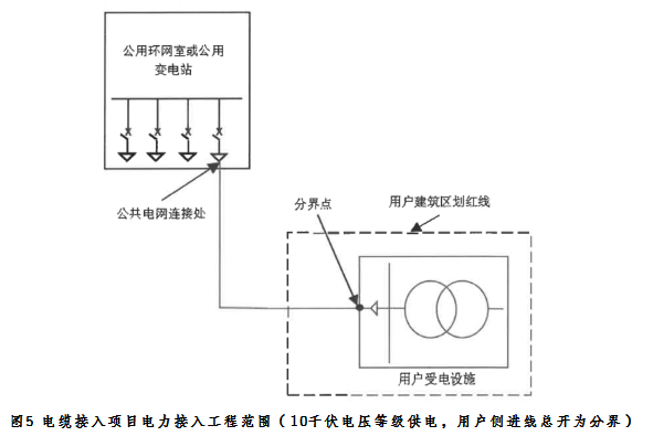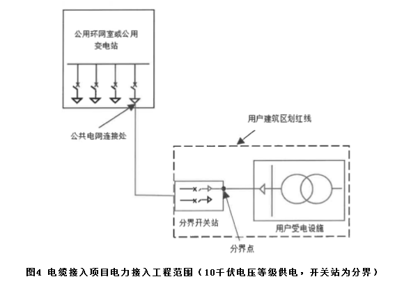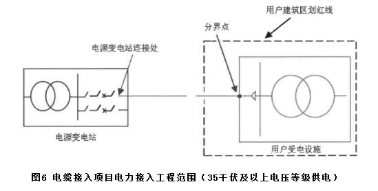 (二)电缆接入项目电力工程范围为建筑区划红线内分界开关站(或用户侧进线总开关)至公共电网连接处(35千伏及以上电压等级供电项目为用户侧进线总开关至电源变电站连接处)的所有电力工程,以用户电源线路接入分界开关站的连接点(35千伏及以上电压等级供电项目为用户侧进线总开关上桩头)为分界点,分界点电源侧供电设施属于电力接入工程范围,负荷侧受电设施由用户投资建设。