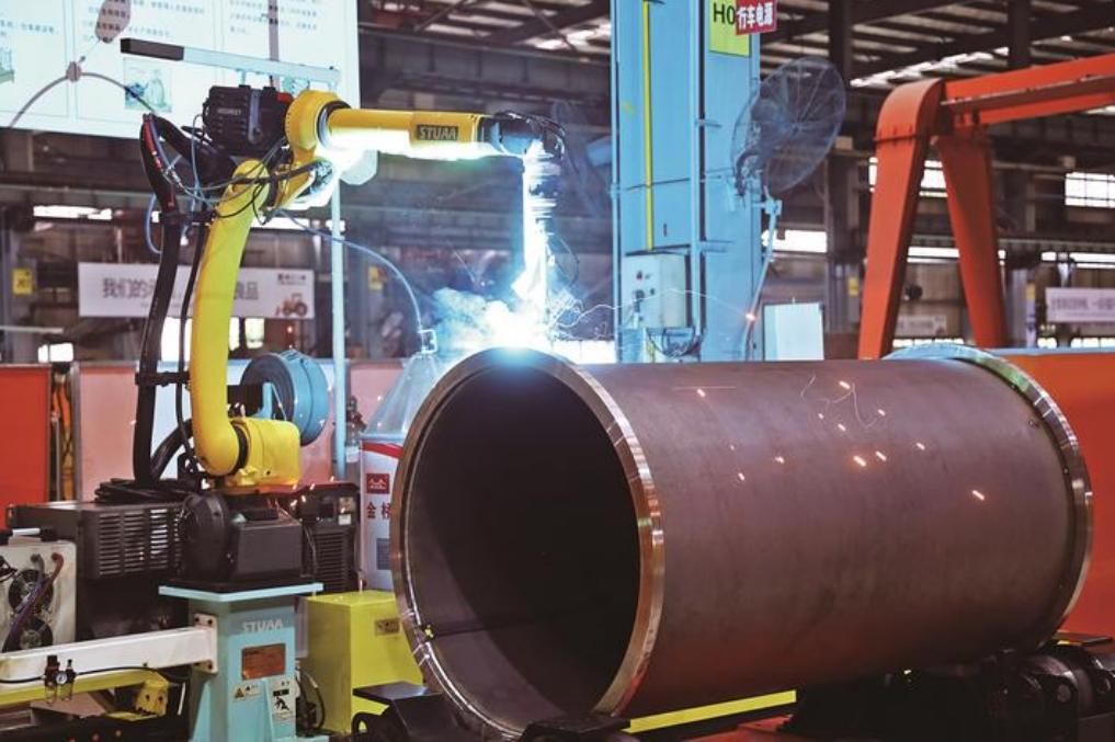 图为9月26日,公司车间内的焊接机器人正精准焊接机座筒体。